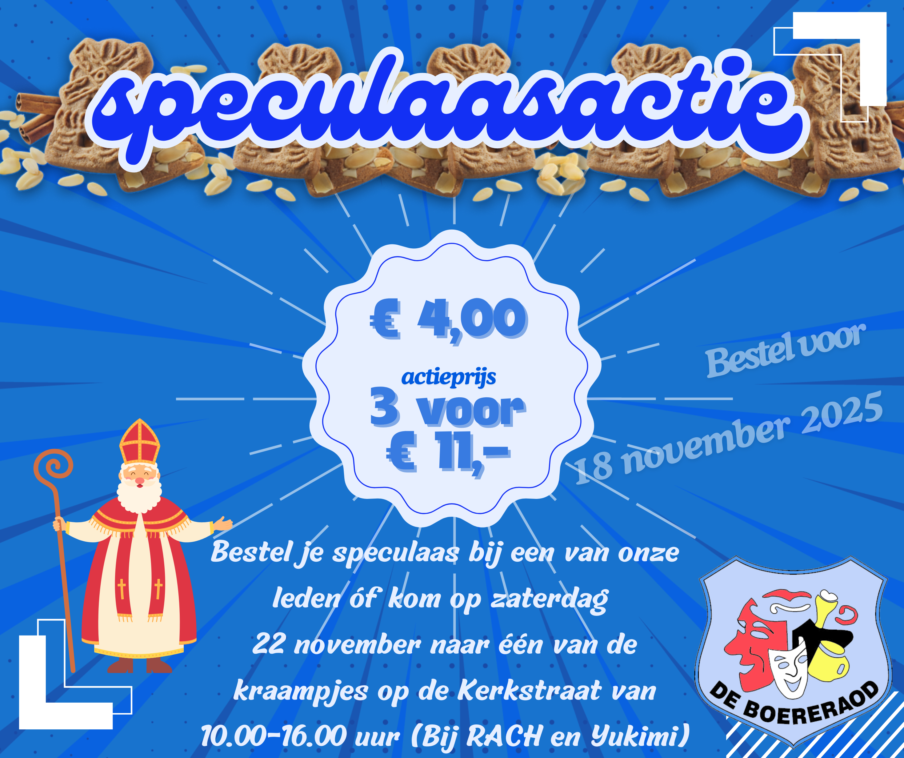 Na het succes van vorig jaar, hebben we dit jaar wederom de speculaasactie! Bestel bij een van onze leden vóór 18 november 2025 of kom